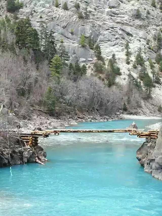 該橋雖然修建年月不詳,但橋的結(jié)構(gòu),做法完全繼承了古人在甘、藏偏僻山區(qū)修建伸臂木梁橋的傳統(tǒng)技藝。 圖片元件、中景、近景的水、橋、山和諧統(tǒng)一,自然優(yōu)美。