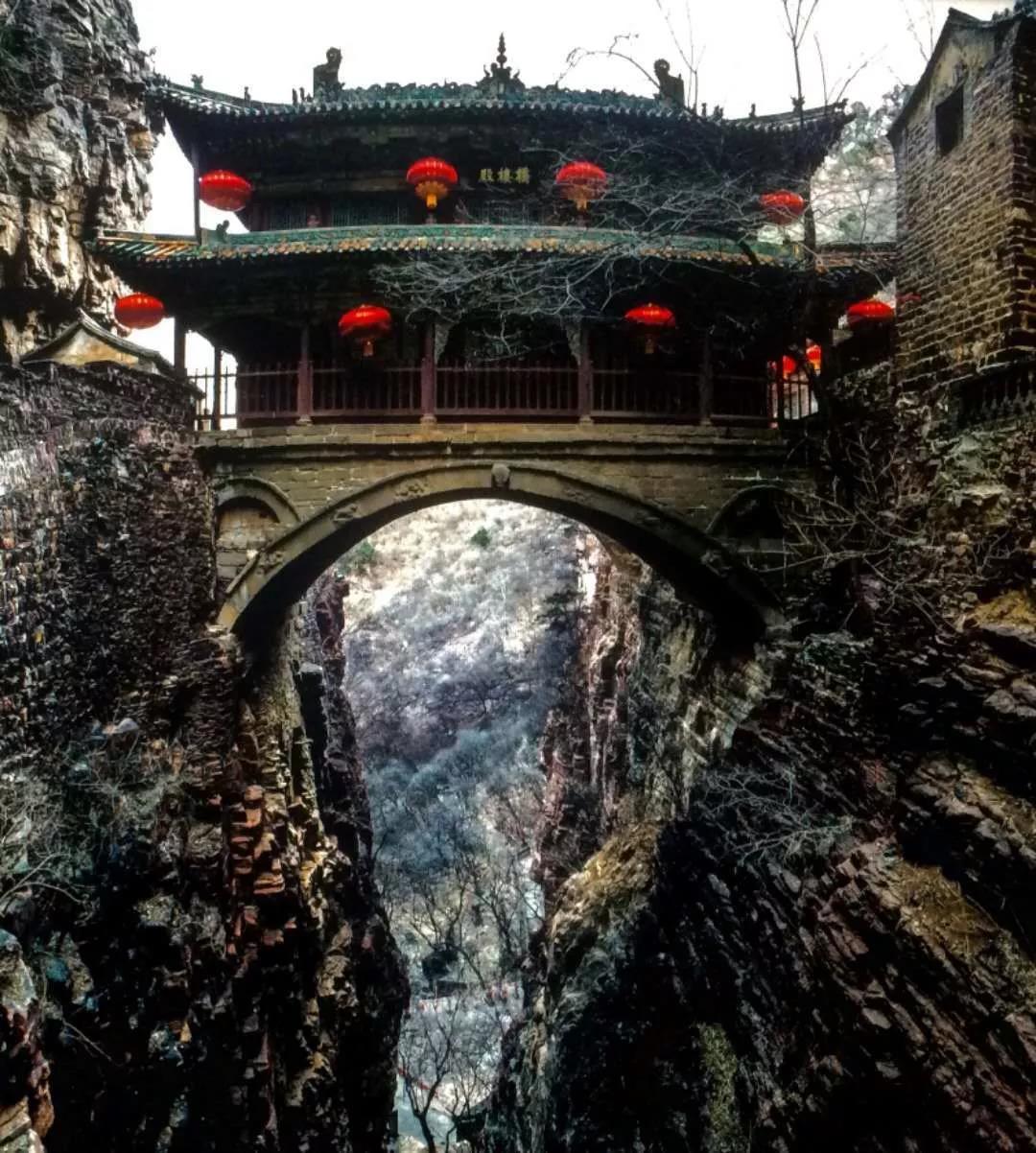 蒼巖山位于河北省井陘縣胡家灘附近,據(jù)傳是隋朝南陽公主出家為尼的地方。陘,古稱即山谷斷裂之地。橋樓殿就建在山梁斷裂的懸崖峭壁上,依托一座長(zhǎng)15米、跨徑10.7米、寬9米的單孔拱券形石橋,地勢(shì)異常險(xiǎn)峻。橋樓殿是我國著名的懸空寺,隋代(公元581年—618年)始建。大橋樓殿坐西向東,大橋樓殿在清朝康熙年間被火焚毀,之后重新修建保存至今。整座建筑為九脊重檐閣樓,石拱單跨回廊式歇山頂廊殿橋式樣,頂覆青黃兩色琉璃瓦。