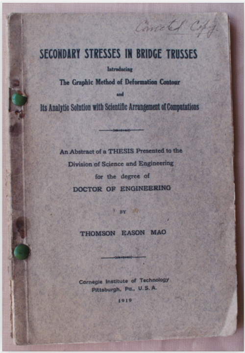 到了10月,博士論文《橋梁桁架內(nèi)的二次應(yīng)力》寫(xiě)成,經(jīng)學(xué)校審查通過(guò)。為了這篇論文,加利基理工學(xué)院土木系主任麥可羅(F.M.McCullough)特別關(guān)懷,字斟句酌,遇有不妥之處即為修改。緊接著,茅以升需要參加博士考試,主考的除橋梁學(xué)教授外,還有其他理工科及經(jīng)濟(jì)學(xué)科的教授,也順利通過(guò)。程序至此,加利基第一個(gè)工程學(xué)博士已經(jīng)在向茅以升揮手,同學(xué)們也已經(jīng)開(kāi)始戲稱他博士了。但學(xué)校還有一個(gè)條件,就是需要將博士論文鉛印100份存校,這也是當(dāng)時(shí)美國(guó)大學(xué)普遍的做法。胡適1917年在哥倫比亞大學(xué)博士考試通過(guò)后,就是由于匆匆回國(guó)沒(méi)有提交鉛印論文,盡管在中國(guó)胡適博士的大名早已叫響,最終也是1927年向哥大補(bǔ)寄完成后才正式獲得哲學(xué)博士文憑。茅以升回國(guó)后在母校唐山工業(yè)專門學(xué)校任教授期間,于1920年12月委托中華書(shū)局鉛印論文100份,寄交美國(guó)后加利基理工學(xué)院于1921年正式頒授博士學(xué)位。