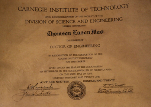 其實(shí),在茅以升之前,通過(guò)庚款、稽勛等官派和自費(fèi)留學(xué),唐校已經(jīng)有金濤、楊杏佛等入讀康奈爾本科,但確實(shí)還未有人申請(qǐng)過(guò)研究院,唐校的本科水準(zhǔn)注冊(cè)主任不知也屬正常。不過(guò),茅以升的考試成績(jī)特佳,給注冊(cè)主任、賈教授都留下了深刻的印象。以前也曾有人寫(xiě)到這次注冊(cè)考試,說(shuō)先考本科,成績(jī)很好,接著又考研究生入學(xué),同樣優(yōu)秀,似乎是為了增加一些戲劇性效果。從有關(guān)史料來(lái)看,注冊(cè)考試只需一次,倘若康校清楚申請(qǐng)者學(xué)校的本科教育水準(zhǔn),有合格文憑,自然也就無(wú)須這樣的考試了。也有人曾寫(xiě)茅以升在康奈爾獲得碩士學(xué)位后,校長(zhǎng)在畢業(yè)典禮上親自宣布,往后唐校畢業(yè)生申請(qǐng)來(lái)康奈爾就讀研究院無(wú)須考試了。此說(shuō)還流傳甚廣,唯獨(dú)茅以升沒(méi)有提及。他倒是饒有興味地提到1917年6月參加碩士(M.C.E.)畢業(yè)典禮那天的情形,畢業(yè)生們都穿禮服入會(huì)場(chǎng),由于只使用一次,別人一般都是去租禮服,而他特別花錢買了一套碩士禮服穿上,并在那天照了一張禮服照。碩士文憑印在羊皮紙上,由康奈爾大學(xué)校長(zhǎng)親筆簽名,茅以升珍藏一生。不知何故,這張碩士禮服照片被不少書(shū)籍和紀(jì)念館標(biāo)注為博士畢業(yè)照,其實(shí)匆匆回國(guó)的他是在提交鉛印博士論文后于1921年才正式授予博士學(xué)位的,為減少加利基理工學(xué)院的麻煩,加上他回到唐山母校后十分忙碌,于是便婉言謝絕了由齊魯大學(xué)代為張羅舉辦學(xué)位授予儀式,自然也不會(huì)留下所謂博士袍照片了。