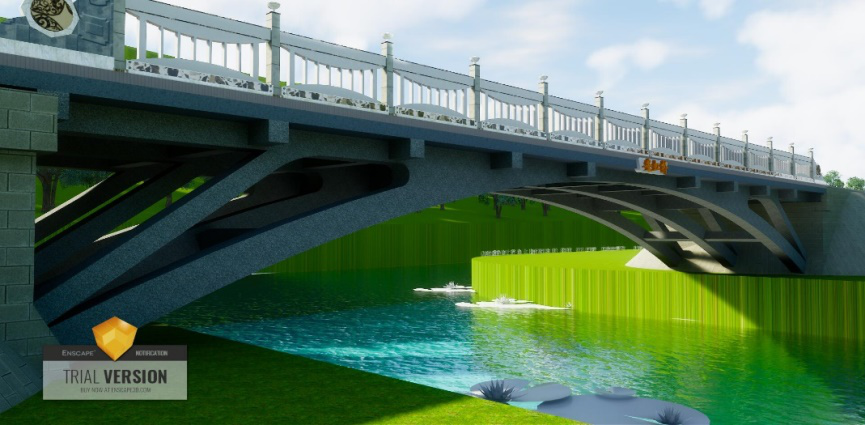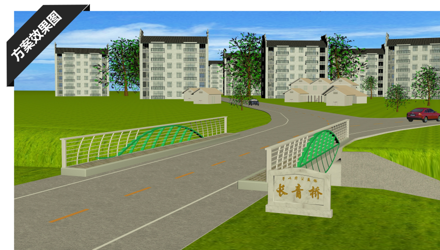 本次方案設(shè)計以“青岡樹葉”為景觀設(shè)計焦點,結(jié)合萬坊村兩岸現(xiàn)狀,力求將橋型融入兩岸風(fēng)光中,打造成為萬坊村內(nèi)的一個標(biāo)志性景觀。本方案利用魚腹梁既有曲線與上部護(hù)欄構(gòu)造,輔以外部裝飾,構(gòu)建萬坊橋青岡樹葉之感,與周圍環(huán)境融合,組成了一幅青舍傍路半畝田,小橋流水共云閑的詩意畫卷。此橋被命名為長青橋,寓萬年長青,生生不息之意。