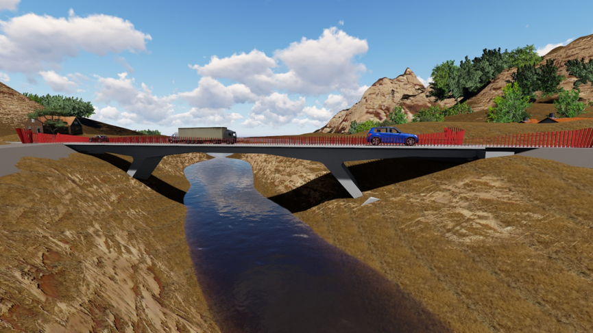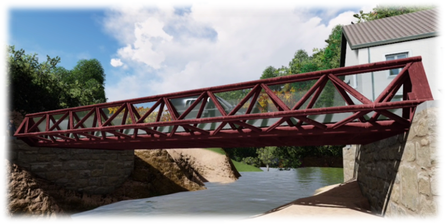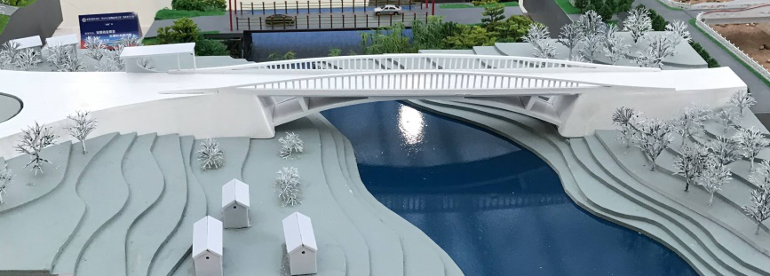作品設(shè)計采用下乘式鋼桁架梁橋方案,設(shè)計構(gòu)思新穎。方案創(chuàng)新性的將鋼桁梁橋的結(jié)構(gòu)高度“搬到”橋面以上,使橋下過水空間最大化,提高了橋梁洪水抗災(zāi)能。同時兩邊的鋼桁架既是橋梁受力的主體承重構(gòu)件,也充當(dāng)橋面護(hù)欄的作用,一舉雙得。
