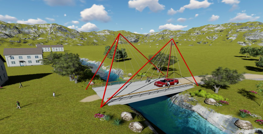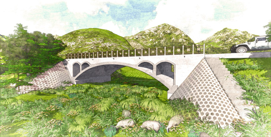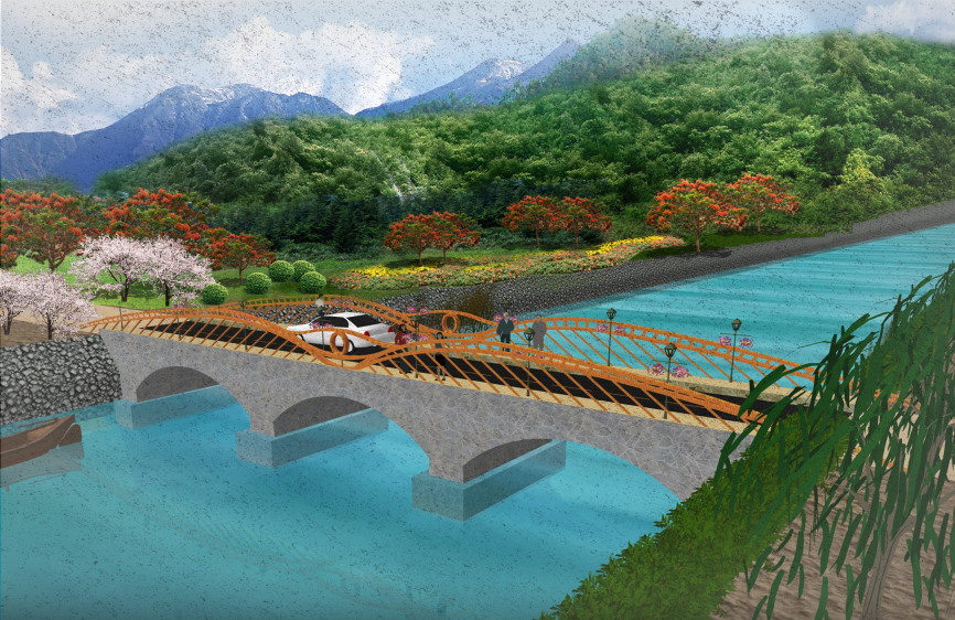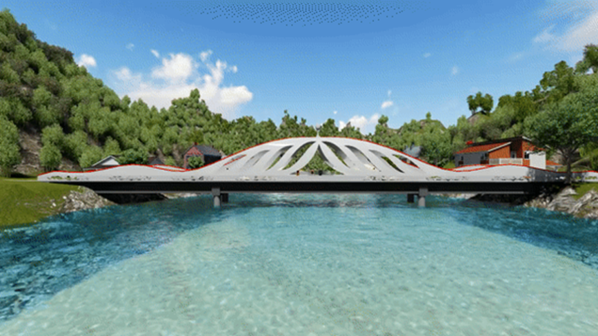 作品采用剛架拱橋方案,預(yù)制拼裝工藝,結(jié)構(gòu)輕盈美觀。鋼筋混凝土結(jié)構(gòu),可以就地取材,建橋成本較低,與公益扶貧的理念切合度較好??紤]到桁架拱橋構(gòu)件數(shù)量較多,連接節(jié)點處受力復(fù)雜,因此,在連接節(jié)點區(qū)域采用高性能復(fù)合材料處理,提高了橋梁的安全性和耐久性。