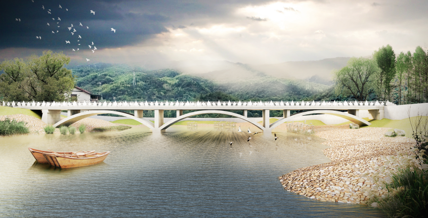 理念——尊重自然:優(yōu)美的混凝土板拱橋與寧靜安謐的鄉(xiāng)村環(huán)境十分和諧,一跨過河的方案最大程度地減少了對自然生態(tài)的擾動。精準(zhǔn)扶貧:我們致力于研究輕型板拱橋的經(jīng)濟(jì)性和可實施性,為貧困山村提供一種安全可靠且經(jīng)濟(jì)實用的公益小橋解決方案,并推廣到相同條件的廣大地區(qū)。回歸力線:簡潔流暢的輕型板拱橋使線條與力流完美融合。關(guān)懷人文:借用古代廊橋與風(fēng)雨亭的理念,并且進(jìn)行了鄉(xiāng)村通往城鎮(zhèn)的人流分析,我們設(shè)計了與拱橋線型相呼應(yīng)的簡易休息亭,在人流匯集的橋頭拉近了人與人之間的距離,我們傳遞的溫暖讓鄉(xiāng)親們不再懼怕嚴(yán)寒和酷暑。