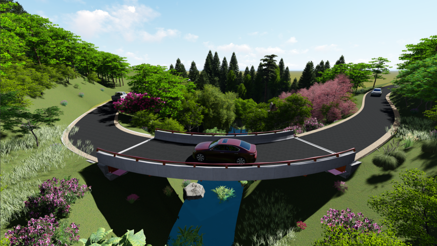 山區(qū)內(nèi)秀麗壯美的自然風(fēng)光本身就是最美的景色。在橋梁設(shè)計上,我們盡可能選擇輕薄的結(jié)構(gòu),將橋梁結(jié)構(gòu)藏于景中,不喧賓奪主,將自然界最本真的美感展現(xiàn)在人們眼前,單跨鋼箱梁彎橋弧度優(yōu)美,結(jié)構(gòu)輕薄,無中墩阻擋視線。