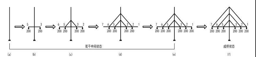 上圖是斜拉橋的安裝成形過程。根據(jù)原理一,只要在結(jié)構(gòu)分析時(shí)增加構(gòu)件單元無應(yīng)力狀態(tài)量的條件,則結(jié)構(gòu)的內(nèi)力和位移與經(jīng)歷的過程無關(guān)。只需令中間狀態(tài)結(jié)構(gòu)已安裝單元的無應(yīng)力狀態(tài)量與成橋狀態(tài)相等,用分階段成形結(jié)構(gòu)的力學(xué)平衡方程直接求解內(nèi)力和位移,分析時(shí)荷載應(yīng)采用當(dāng)前狀態(tài)下已施加于結(jié)構(gòu)的總荷載。用原理二中的無應(yīng)力索長調(diào)整與索力變化的關(guān)系,依據(jù)結(jié)構(gòu)的實(shí)際受力需要,拉索的無應(yīng)力長度分次調(diào)整到位。根據(jù)原理三,只要以拉索的無應(yīng)力長度差值(張拉端錨固螺母位置的移動量)代替拉索張力作為調(diào)索控制手段,則可實(shí)現(xiàn)拉索調(diào)索與其他工序操作并行作業(yè)。