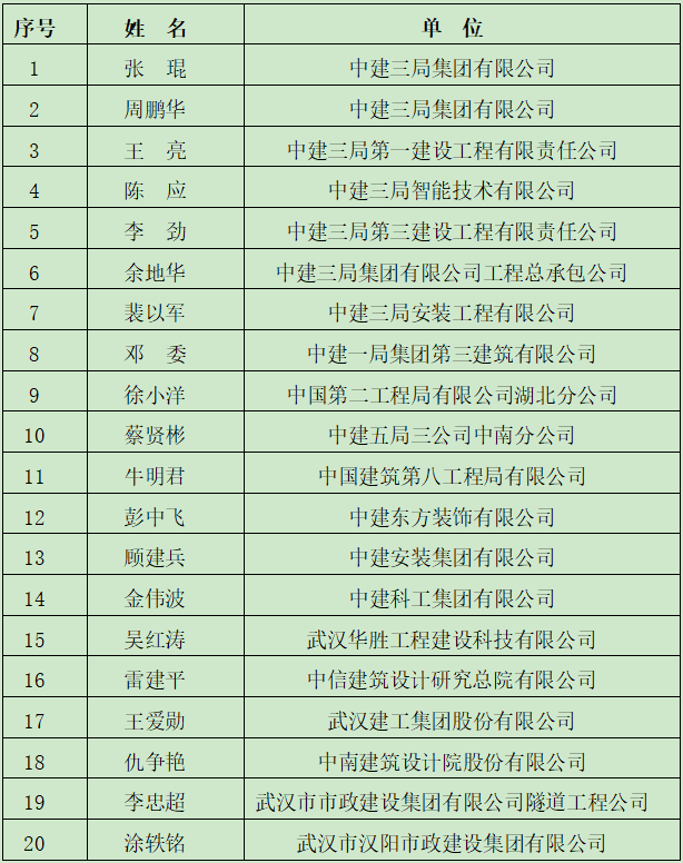 2020年9月25日,“茅以升科學(xué)技術(shù)獎(jiǎng)——建造師獎(jiǎng)(特殊貢獻(xiàn)獎(jiǎng))”終評(píng)會(huì)在京召開(kāi)。評(píng)審委員會(huì)由茅玉麟理事長(zhǎng)任召集人,盧耀如院士任評(píng)委會(huì)主任,聶建國(guó)、李明安、肖從真、毛志兵、張晉勛、馮躍、薛峰等專(zhuān)家任委員。根據(jù)《茅以升科學(xué)技術(shù)獎(jiǎng)——建造師獎(jiǎng)(特殊貢獻(xiàn)獎(jiǎng))獎(jiǎng)勵(lì)條例》、《茅以升科學(xué)技術(shù)獎(jiǎng)——建造師獎(jiǎng)(特殊貢獻(xiàn)獎(jiǎng))評(píng)選工作實(shí)施細(xì)則》等有關(guān)規(guī)定和要求,經(jīng)評(píng)審委員會(huì)評(píng)審,推選出“中建三局‘兩山’醫(yī)院創(chuàng)新建設(shè)團(tuán)隊(duì)”榮獲創(chuàng)新團(tuán)隊(duì)獎(jiǎng)、張琨等20人榮獲個(gè)人獎(jiǎng)、尚樂(lè)樂(lè)等4人榮獲青年獎(jiǎng)。