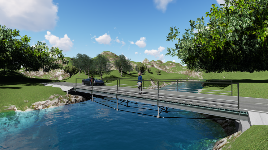 方案以“青岡樹葉”為景觀設計焦點,結(jié)合萬坊村兩岸現(xiàn)狀,力求將橋型融入兩岸風光中,打造成為萬坊村內(nèi)的一個標志性景觀。魚腹梁既有曲線,又與上部護欄相對應構(gòu)建萬坊橋青岡樹葉之感,與周圍環(huán)境融合,組成了一幅青舍傍路半畝田,小橋流水共云閑的詩意畫卷。此橋被命名為長青橋,寓萬年長青,生生不息之意。