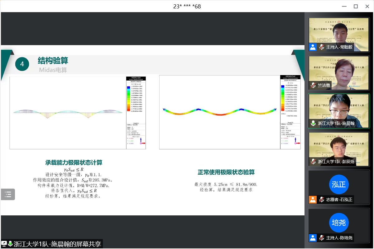 7月17日上午,大賽總決賽在線上舉行。香港土木工程署原署長(zhǎng)、大賽評(píng)審委員會(huì)主席劉正光,基金會(huì)秘書長(zhǎng)劉曉光,中國(guó)交通建設(shè)股份有限公司副總工程師孟凡超,中國(guó)交通建設(shè)股份有限公司副總工程師蔣中貴,原北京市市政工程設(shè)計(jì)研究總院總工程師包琦瑋擔(dān)任總決賽評(píng)委。入圍總決賽的8支隊(duì)伍依次用PPT及視頻等方式對(duì)自己的設(shè)計(jì)作品進(jìn)行了充分展示,現(xiàn)場(chǎng)回答了專家評(píng)委的提問并接受評(píng)審。