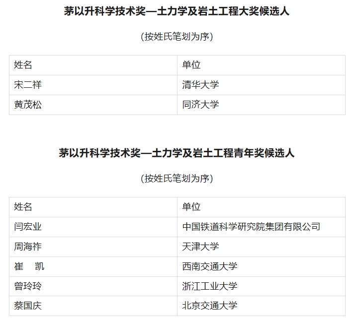 第十六屆“茅以升科學(xué)技術(shù)獎—土力學(xué)及巖土工程大獎”、“茅以升科學(xué)技術(shù)獎—土力學(xué)及巖土工程青年獎”評審會于2024年12月6日在北京召開。根據(jù)《茅以升科學(xué)技術(shù)獎—土力學(xué)及巖土工程大獎實施細(xì)則》、《茅以升科學(xué)技術(shù)獎—土力學(xué)及巖土工程青年獎實施細(xì)則》等規(guī)定,由北京茅以升科技教育基金會、中國土木工程學(xué)會、土力學(xué)及巖土工程分會相關(guān)專家組成評審委員會。本屆大獎、青年獎經(jīng)過推薦申報、資格審核、專業(yè)預(yù)審、評審委員會終審等程序,共評選出大獎候選人2名、青年獎候選人5名,現(xiàn)將評審結(jié)果向社會公示。