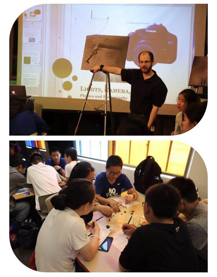第十天,北京交大附中茅以升工程班的學(xué)子來到了麻省理工學(xué)院博物館,等待他們的是一節(jié)把物理與攝影相結(jié)合的動(dòng)手課程,這堂課的核心是把人類眼睛看不到的物理現(xiàn)象用先進(jìn)的攝影技術(shù)表現(xiàn)出來。老師先是讓同學(xué)自由發(fā)揮擺放自己感興趣的磁鐵排列形狀,然后讓大家大膽預(yù)測(cè)畫出磁感線分布圖,最后老師向每個(gè)“創(chuàng)意”磁鐵上撒上細(xì)細(xì)的鐵屑,讓大家觀察實(shí)際的磁感線到底是什么樣子,設(shè)計(jì)并捕捉自己的物理實(shí)驗(yàn)圖片,這就是MIT。